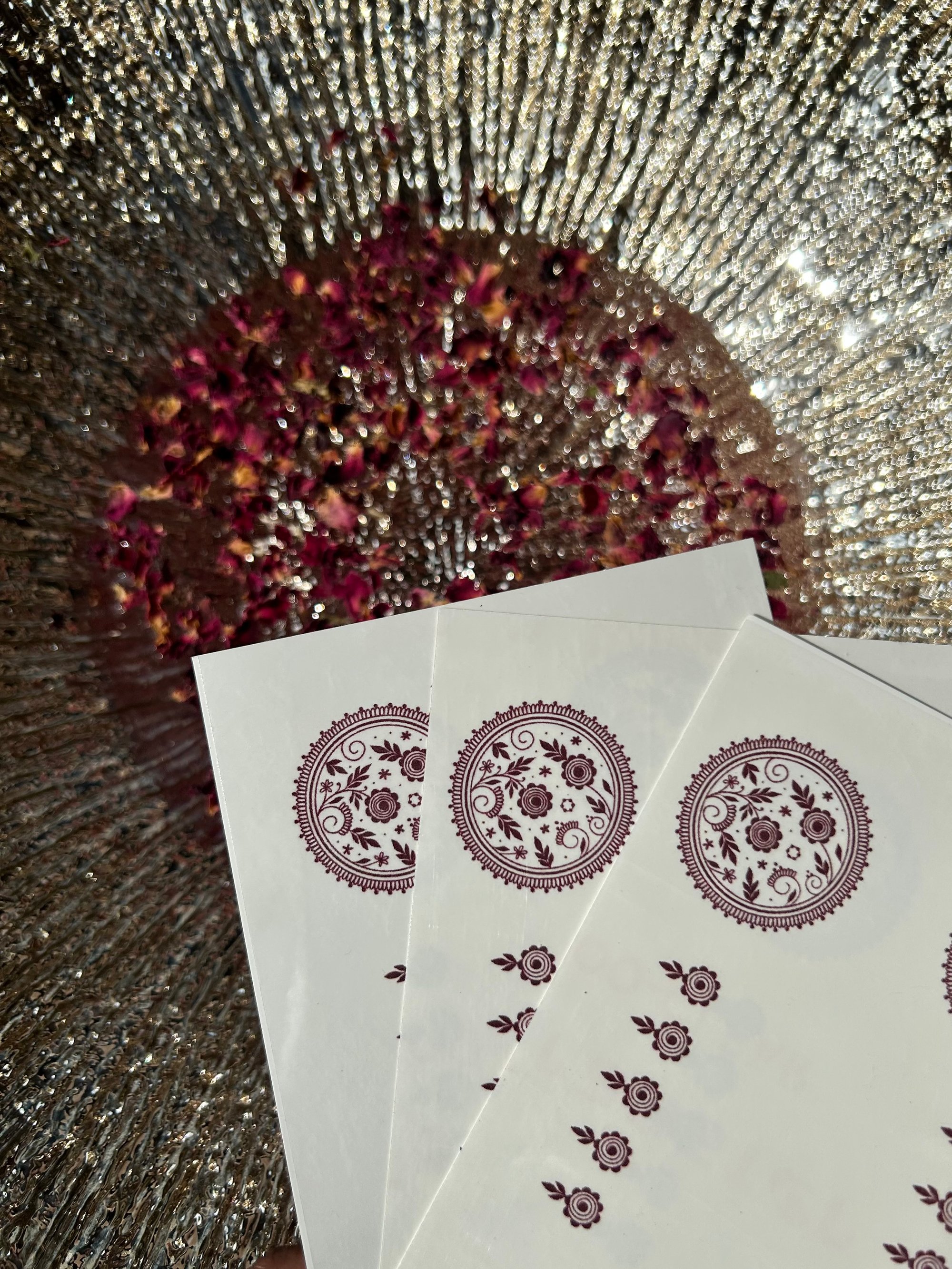 Our temporary henna tattoos are perfect if you love the look of henna, but don’t have the time to get it done professionally. They give you all the intricate beauty of traditional mehndi-without the cones, stains, or waiting and lasts for 1-2 days. Just press on with water, peel and go!